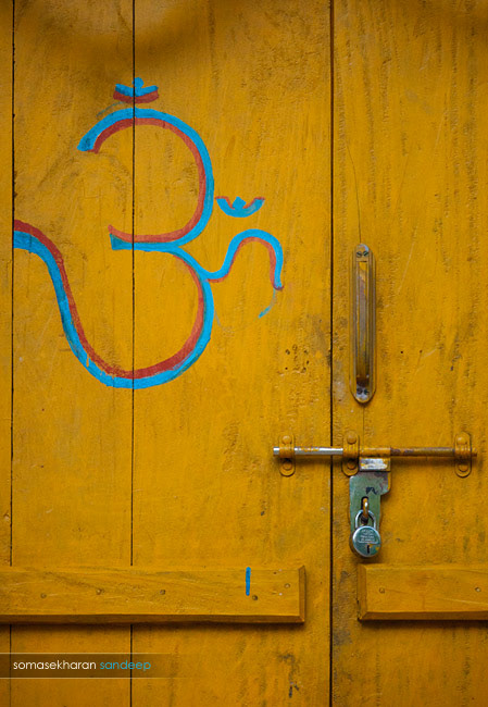 The inscription "Om" on the door of a temple, in Brymore Estate, Kerala, India. The Om sound is what is incanted before the recital of spiritual texts or verses.