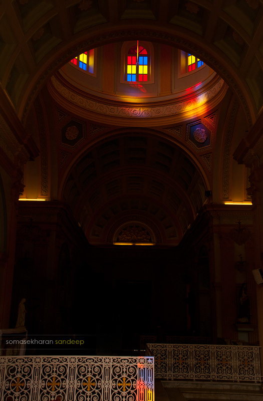 Stained glass windows create incredible lighting effects on the insides of this French Cathedral in Pondicherry, India.
