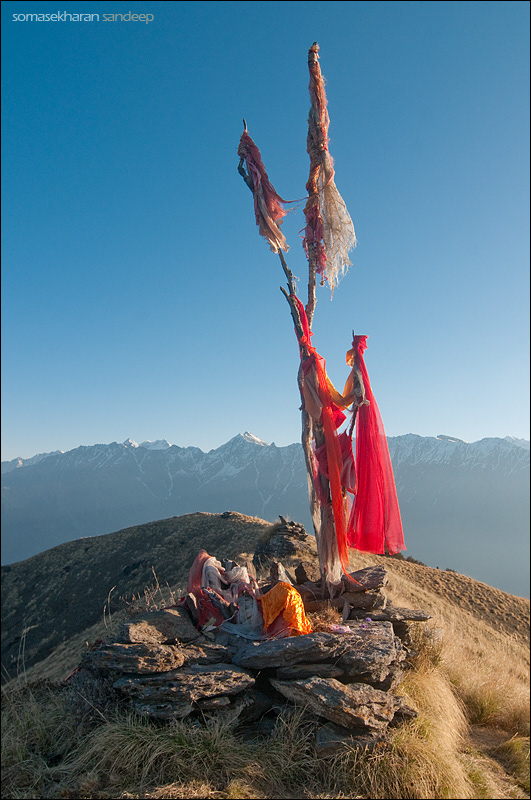 A makeshift shrine atop Dhel Thatch, Great Himalayan National Park, India. These shrines are built with just a few slabs of rock and the devoutees pile up small offerings like shiny clothes, small denominations of money and even shiny objects like old broken locks and number plates of cars here.