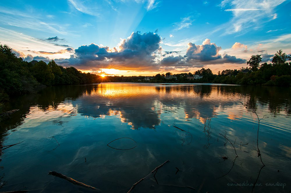 I am out for a walk, and decide to carry my camera just for the heck of it. After 45 minutes of walking and no photographing, I head back home, with a tiny drizzle in the air. But as I climb a hillock, I see a gap in the clouds right in the horizon in the west. That is typically something that makes nuclear sunsets. I start sprinting to an adjacent lake, and get there just in time for this.