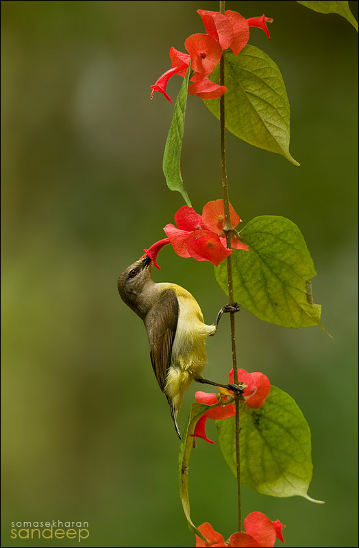 The female of a purple sunbird dips its beak into the tube of a flower, Mysore , India