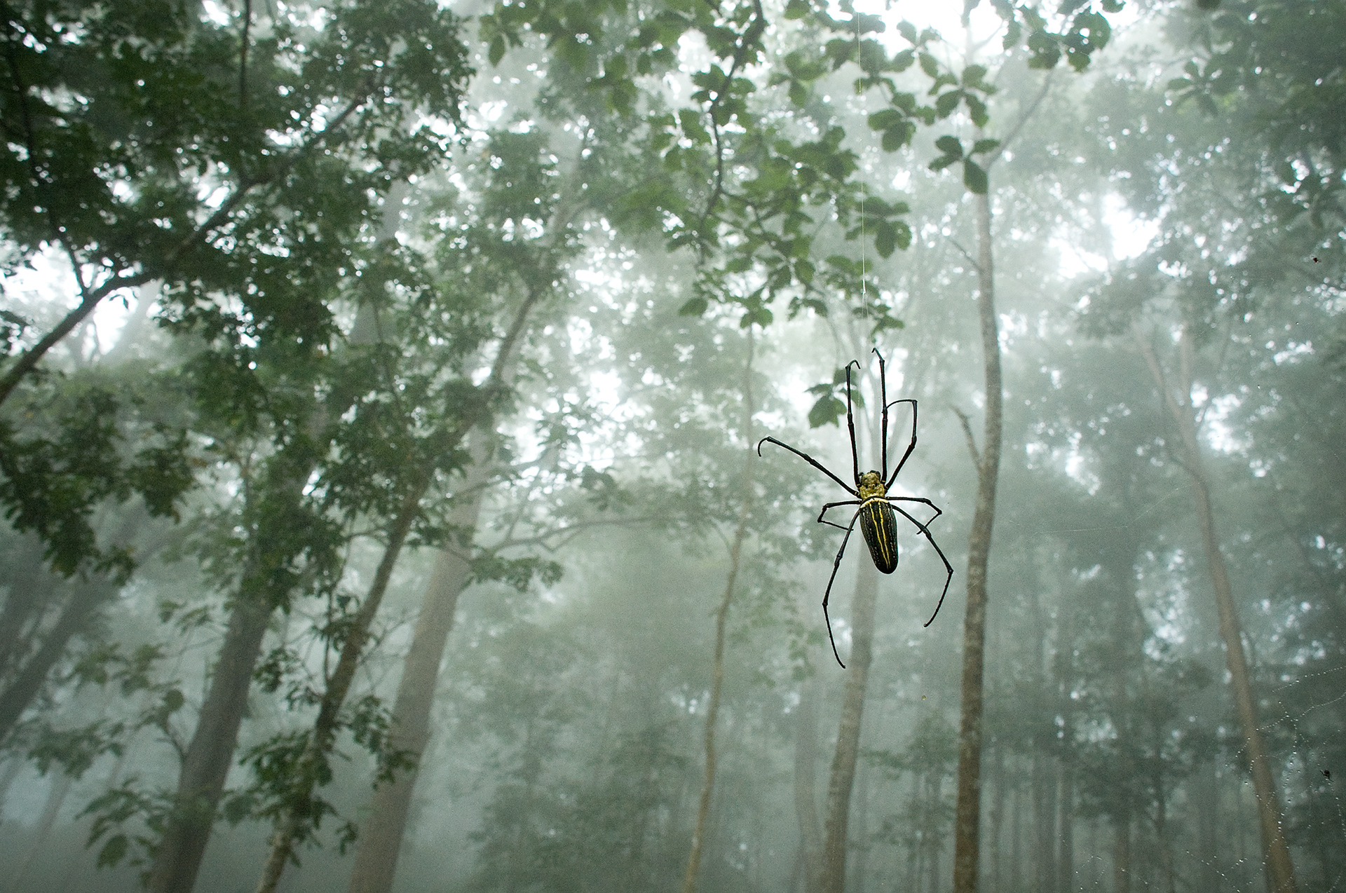 A giant wood spider paints a creepy picture in the misty woods of Dandeli, India, Fall '11